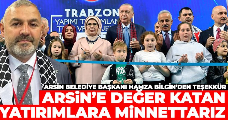 Arsin Belediye Başkanı Hamza Bilgin, Trabzon’da gerçekleştirilen yatırımlardan ötürü Cumhurbaşkanı Recep Tayyip Erdoğan’a teşekkür etti. Hayri Gür Kapalı Spor Salonu'nda, “Trabzon’da Yapımı Tamamlanan Tesis ve Projelerin Toplu Açılış Töreni”nde konuşan Cumhurbaşkanı Erdoğan, açılışı gerçekleştirirken toplam 13.5 Milyar TL’yi aşan 130 projeyi Trabzon’a kazandırdıklarını açıkladı.