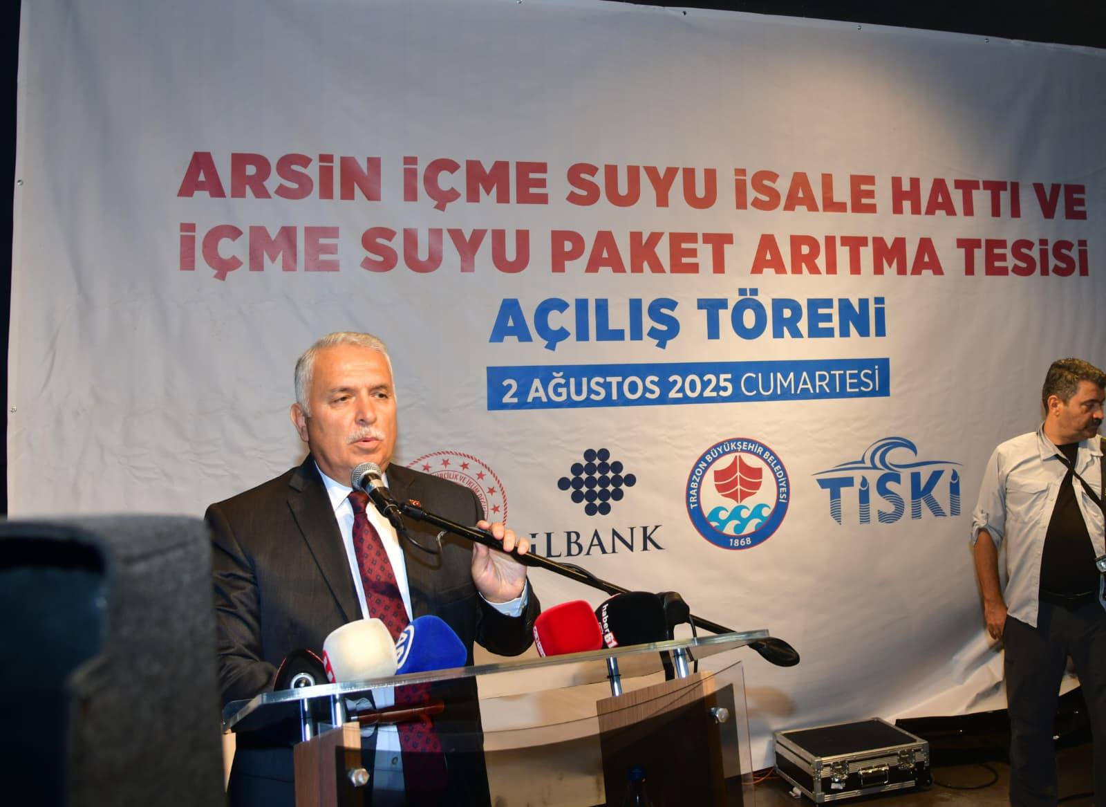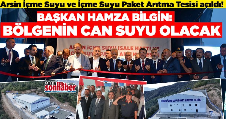Trabzon’da; Arsin’in 32, Araklı’nın 7 ve Yomra’nın 3 mahallesi olmak üzere toplam 42 mahallede 36 bin kişiye hizmet verecek olan Arsin İçme Suyu ve İçme Suyu Paket Arıtma Tesisi, 1 milyar 421 milyon TL’lik maliyetiyle hayata geçti. Uzun yıllardır çözülemeyen su sorununu çözüme kavuşturacak tesis ile ilgili konuşan Arsin Belediye Başkanı Hamza Bilgin, “Yıllardır ilçemizin en temel sorunlarından biri olan içme suyu problemi, çok şükür artık geride kalacak. Bu sorunu geçici çözümlerle değil, kalıcı yatırımlarla çözmek için hep birlikte yola çıktık, bu azmin, bu iradenin, bu kararlılığın somut bir eserini hizmete açtık.” ifadelerini kullandı.