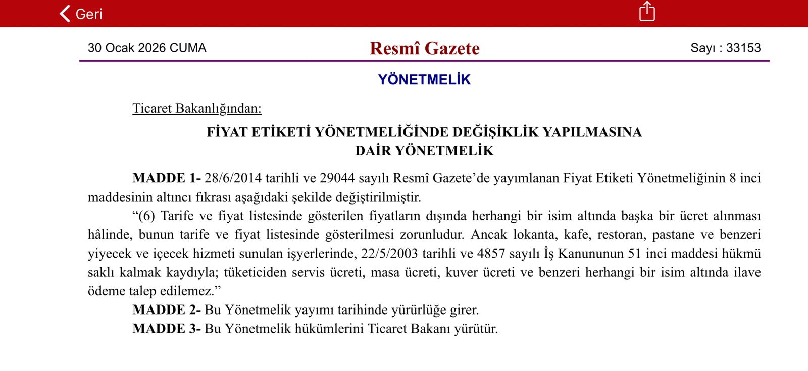 Resmi Gazete’de yayınlanan düzenleme sonrası Ticaret Bakanlığı açıklama yaptı. Bakanlık, artık işletmelerin masa ve servis ücreti alamayacağının altını çizerek uyarılar yaptı.
