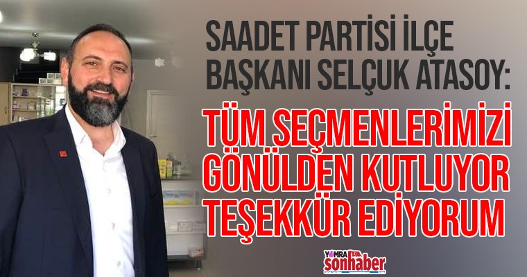 Saadet Partisi Yomra İlçe Başkanı Selçuk Atasoy, seçim sonrası açıklamalarda bulundu. Seçmenlerine teşekkür eden Atasoy, “İktidar ve muhalefet hangi tarafa oy verirse versin tüm seçmenlerimizi gönülden kutluyor ve teşekkür ediyorum” dedi.