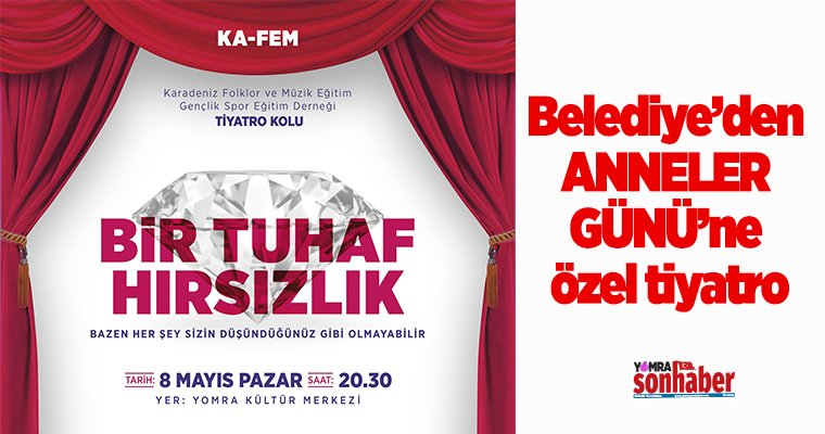 Yomra Belediyesi’nden 8 Mayıs Anneler Günü için anlamlı etkinlik. Anneler Günü için Yomra Kültür Merkezi’nde tiyatro oyunu ücretsiz olarak sergilenecek. Karadeniz Folklor ve Müzik Eğitim Gençlik Spor Eğitim Derneği Tiyatro Kolu’nun (KA-FEM) tarafından oynanacak olan ‘Bir Tuhaf Hırsızlık’ adlı tiyatro oyunu 8 Mayıs Pazar Günü saat 20.30’da Yomra Kültür Merkezi Muammer Pekşen Konferans Salonu’nda izleyicilerle buluşacak.