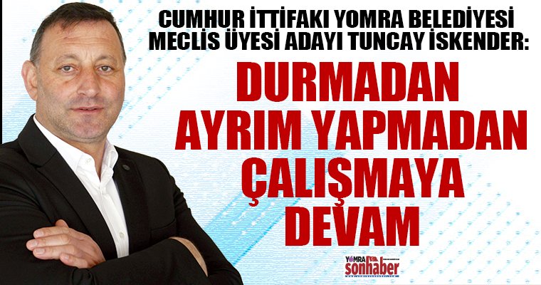 ■ Her zaman sahada vatandaşın yanında olduğunu belirten Tuncay İskender, “Her zaman olduğu gibi yine sahada vatandaşımızla bir aradayım. Siyasi görüşü ne olursa olsun tüm vatandaşlarımızın yanında olup istek ve taleplerini Yomramızın gündeminde tutacağım. Vatandaşlarımızdan destek bekliyorum” dedi.