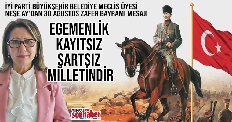 İYİ Parti Büyükşehir Belediye Meclis Üyesi Neşe Ay, 30 Ağustos Zafer Bayramı hakkında mesaj yayımladı. Ay mesajında, “30 Ağustos, tarihe karışmış olduğu düşünülen bir milleti yeniden vatan toprağına ve bağımsızlığına kavuşturan bir değer olmasından öte, "Egemenlik kayıtsız şartsız milletindir” iradesiyle cumhuriyetçi, demokratik ve modern hukuk devleti olmanın da miladıdır.” dedi.